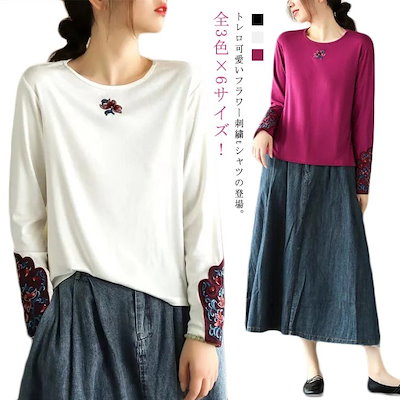 カットソー 長袖tシャツ フラワー刺繍tシャツ tシャツ レディース トップス 花柄 刺繍tシャツ 春 コットン ロングT ラウンドネック 秋 エスニック トレロ