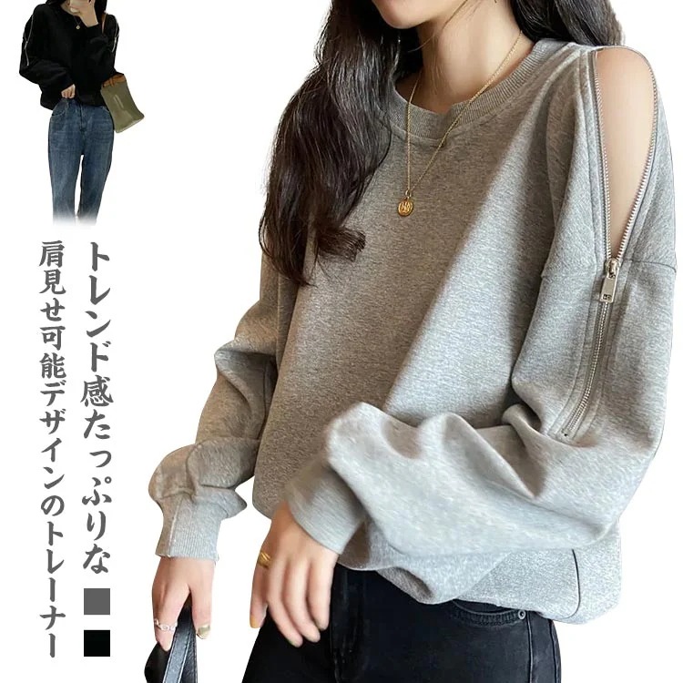 薄手 個性的 トップス 春秋 パーカー プルオーバーパーカー きれいめ スウェット XL 長袖 韓国風 ラウンドネック ジップ付き レディース ゆったり 無地 カジュアル 可愛い 肩見せ 着痩せ 大き