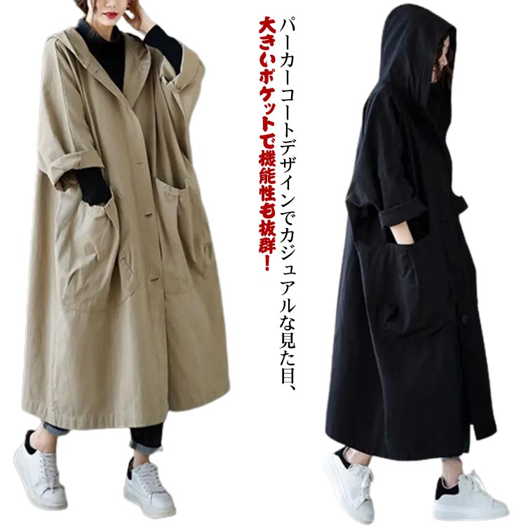 膝下丈 アウター オーバーサイズ 秋 ゆったり 春 ロング レディース カジュアル ポケット シンプル フード ロングパーカー スプリングコート モッズコート アウター ジャケット マウンテンパーカー