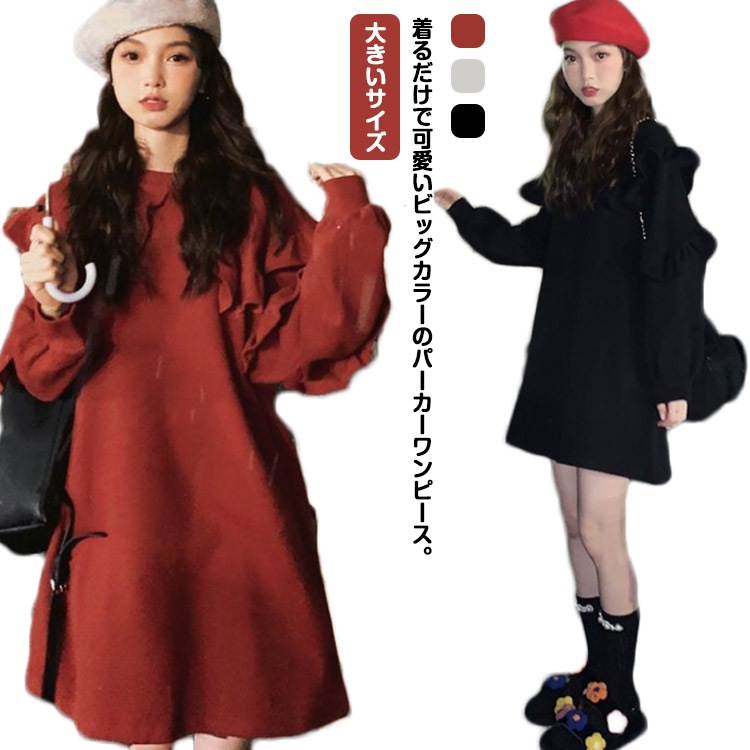 プルオーバーパーカー ビッグカラー トップス 3XL かわいい 長袖 フリル XL 大きいサイズ レディース 春秋 ボリューム袖 おしゃれ フェミニン かわいい パーカー M L パーカーワンピース