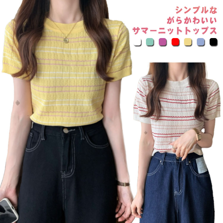 トップス きれいめ 大人 半袖 春 可愛い サマーニット サマーセーター ニットソー ニット 夏 カジュアル 韓国ファッション Tシャツ シンプル レディース 秋 ボーダー柄 ゆったり 薄手 クルーネ