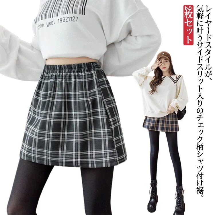 おしゃれ 付け裾 秋 L 2枚セット つけ裾 サイドスリット レディース 冬 春 夏 チェック インナー 重ね着 ゴムウエスト レイヤードインナー レイヤードトップス 大きいサイズ レイヤード M X