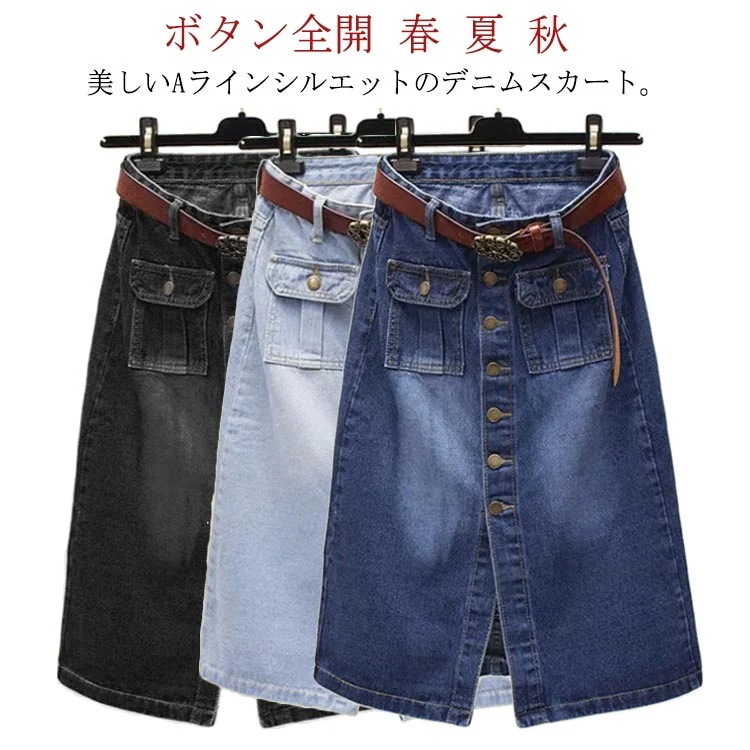 スカート 秋 膝丈 ボタン全開 ハイウエスト デニムスカート スリット フロントボタン ミディアムスカート タイトスカート 大きサイズ 春 夏 ポケット付き 通勤 Aラインスカート