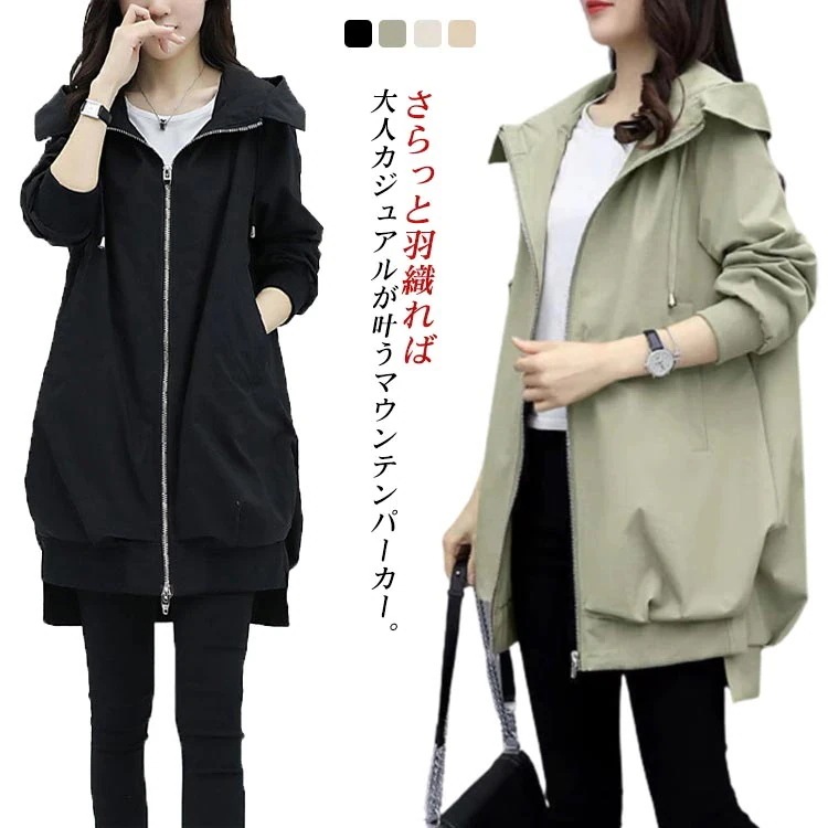 マウンテンパーカー 体系カバー 黒 ライトアウター フード付き スプリングコート モッズコート アウトドア ジャケット 羽織り ブルゾン レディース 春アウター 長袖 カジュアル 春 秋 ロング ゆっ