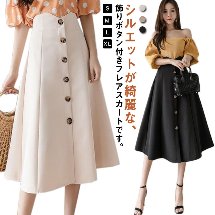 飾りボタン ロングスカート フレアスカート オフィス ハイウエスト スカート フロントボタン バックファスナー ボトムス カジュアル 無地 キレイめ 通勤 Aライン