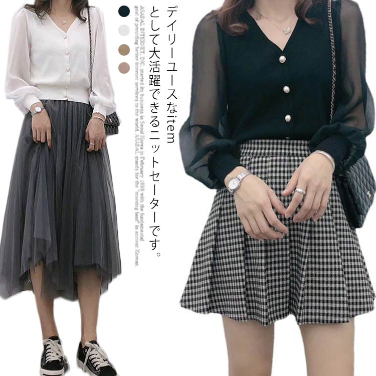 ニット Vネック 春秋物 シンプル ニットソー 薄手 長袖 パフスリーブ カジュアル ゆったり トップス レディース 透け感 お洒落 プルオーバー キレイめ 着痩せ 異素材 フェミニン