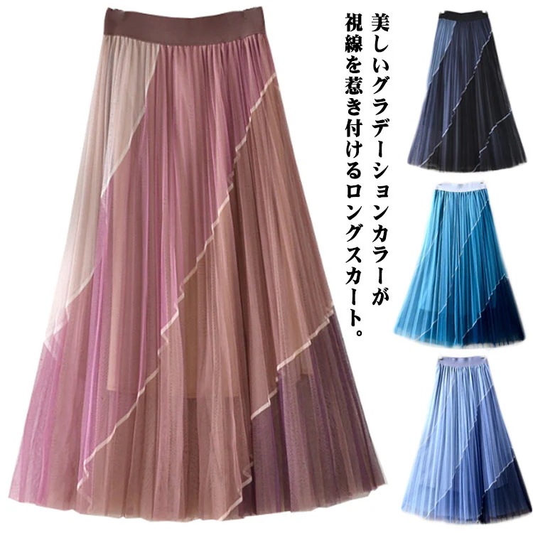 チュールスカート レディース プリーツスカート ボリューム ふんわり 透け感 フレア お洒落 裏地付き 配色 グラデーション 春 夏 秋 パステルカラー フェミニン ウエストゴム Aライン ロングスカ