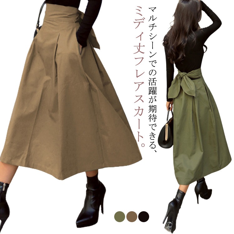 バックリボン スカート フレアスカート カジュアル ミディアム ロングスカート レディース ミモレ丈 ハイウエストスカート ボトムス きれいめ 通勤 30代 足長効果 大人 可愛い Aライン