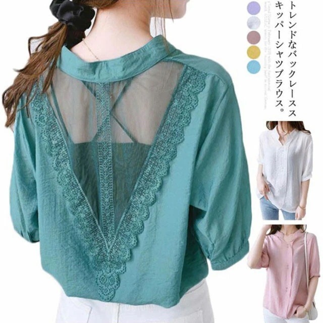 【】ブラウス シャツ レディース トップス チュニック キーネック 半袖 後ろレース バックレース Vネック シースルー 切り替え 薄手 とろみ 透け感 シアー シャツ プルオーバー 大人 上