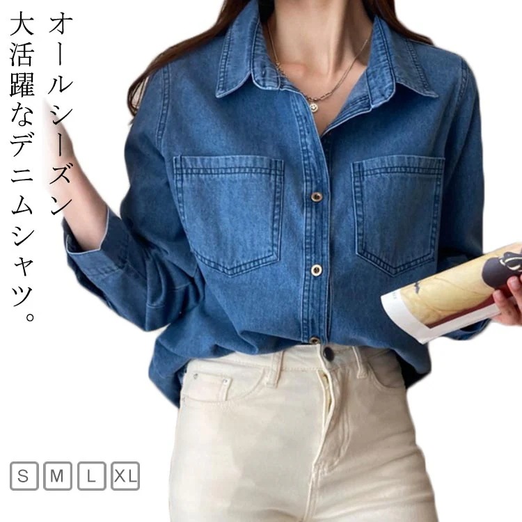 長袖 トップス 春秋 ブラウス 大きいサイズ レディース シャツ デニムシャツ ウエスタンシャツ 羽織 ウォッシュ加工 ブルー