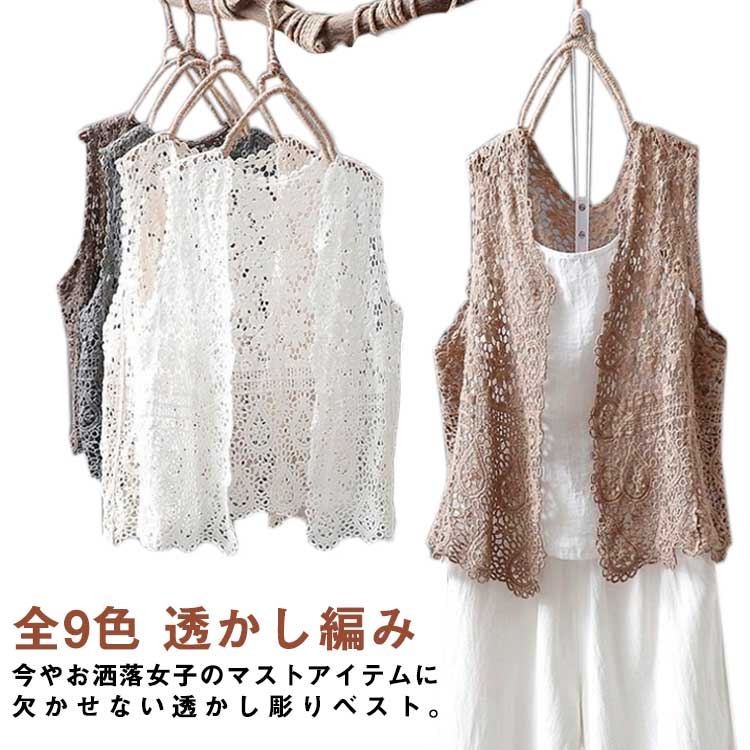 全9色 レディース ノースリーブ 着痩せ 透かし編み 春夏 ベスト トップス 50代 ジレ 透かし彫り アウター 前開き おしゃれ ゆったり グレー ブラック ホワイト ベージュ 20代 30代 40