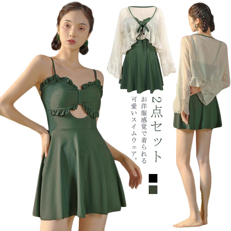 ママ水着 体型カバー 2点セット 可愛い ワンピース ぽっちゃり 水着 羽織り 透け感 ビキニ フリル タンキニ ミセス 日焼け防止 長袖カーディガン スイムウェア ボレロ フェミニン ラッ