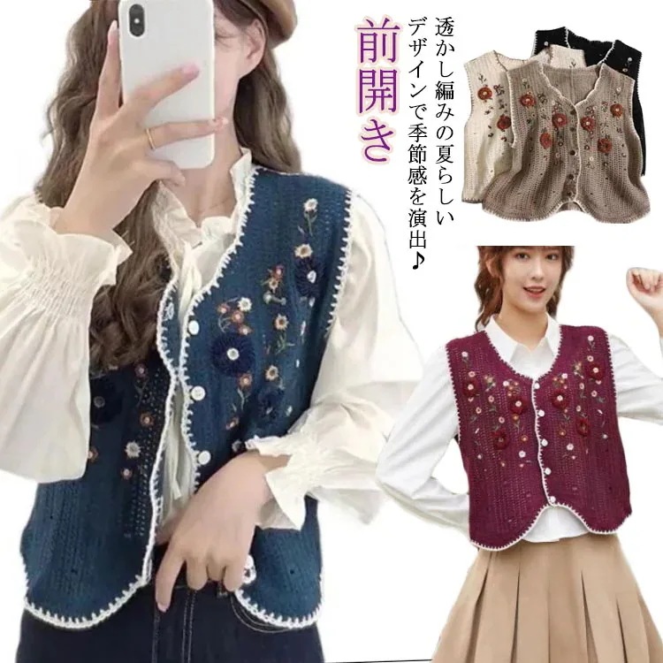 前開き 春夏 トップス ベスト 刺繍レース おしゃれ レディース ジレ ノースリーブ 重ね着 サマーニット 透かし編み ショート丈 アウター 柔らかい 花柄 総柄 カジュアル vネック