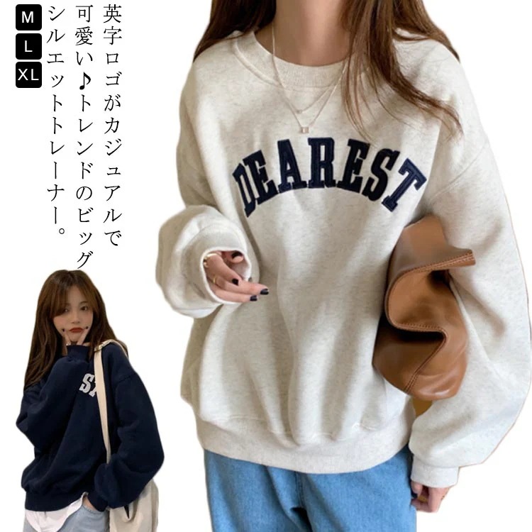 春 レディース ロゴ スウェット トレーナー クルーネック ゆったり トップス 秋 おしゃれ オーバーサイズ カジュアル ビッグシルエット ドロップショルダー 長袖