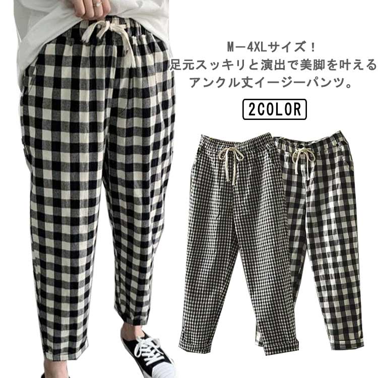 チェック柄パンツ チェック柄 ウエストゴム イージーパンツ カジュアルパンツ サルエルパンツ 柄 楽チン サルエルパンツ ボトムス パンツ 9分丈 春 秋 夏 テーパードパンツ
