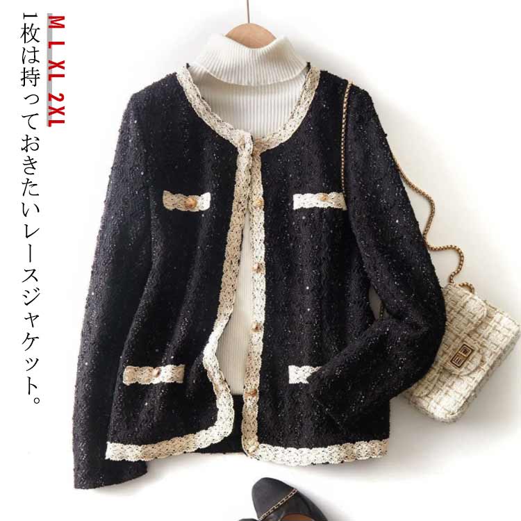 XL 羽織り レディース お呼ばれ レースジャケット ツイード風 長袖 ショート丈 ジャケット 秋 薄手 卒業式 入学式 入園式 ノーカラージャケット 韓国ファション M L 春