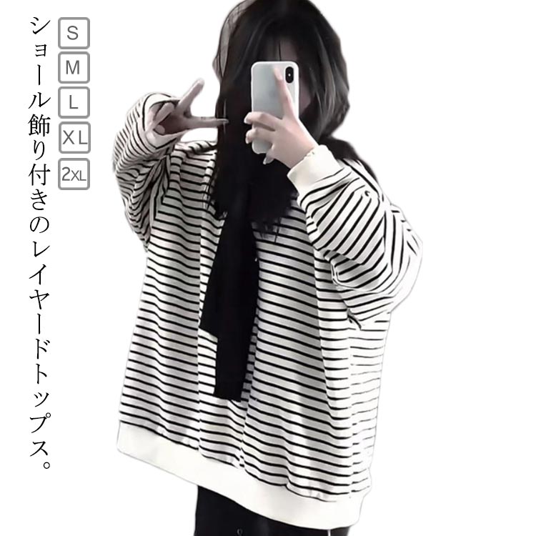 ボーダー柄 レイヤードトップス ショール付き tシャツ レディース カットソー レイヤードトップス 春 秋 トレーナー 大きサイズ 体型カバー ゆったり オーバーサイズ