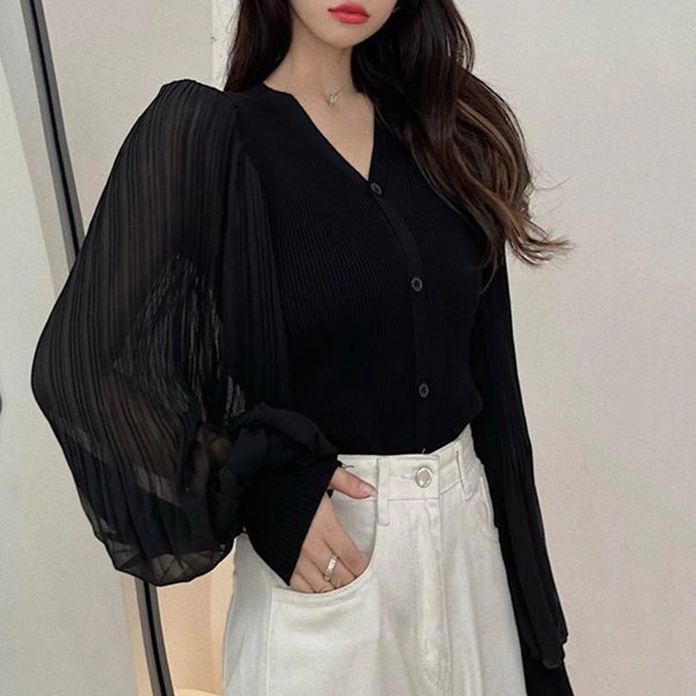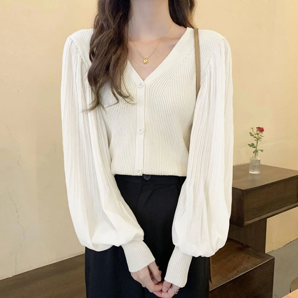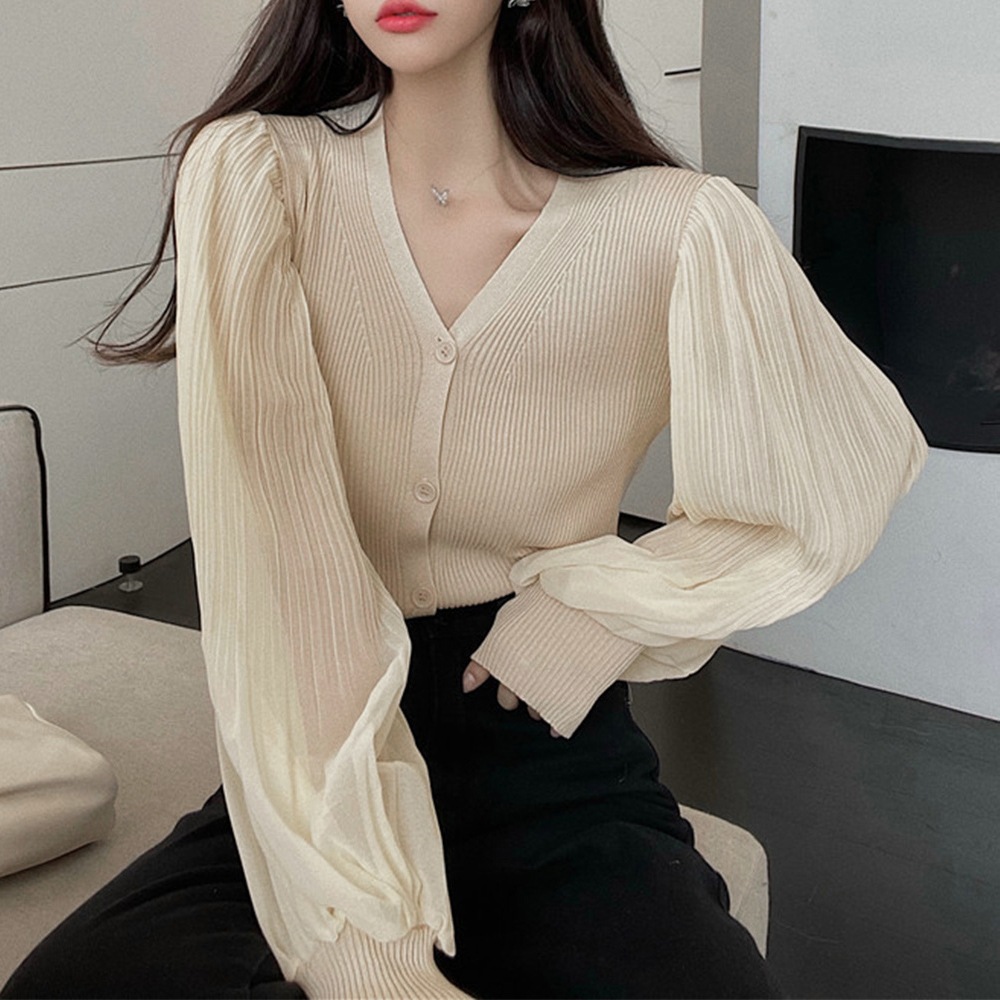 リブニット ニットカーディガンボリューム袖Vネック