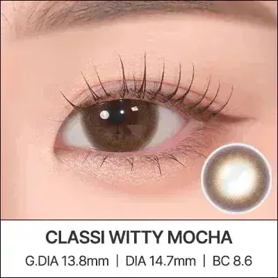 WITTY MOCHAです。焦茶目ですが自然に馴染む色味です!!着色直径13.8mmとのことですが、かなりぼかしフチなので体感13.7mmくらいかもしれません。裸眼風でデイリー使いにぴったりですが、特別に工夫があるようなデザインではないので盛れ感や感動があるレンズではないです。でもお安いのと1monthなのでコスパや汎用性はかなり高いと思います!!