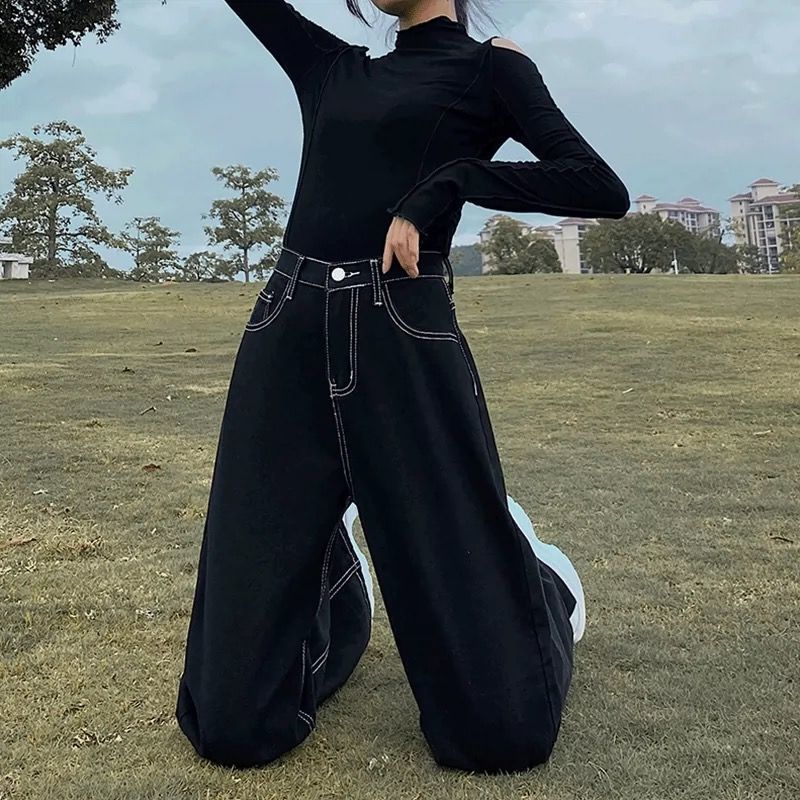 韓国ファッション デニムパンツ ブラックギャザーストレートジーンズレディース秋冬新作韓国版ハイウエストで細く見えるゆったりとしたワイドなドレープ感のモップパンツ