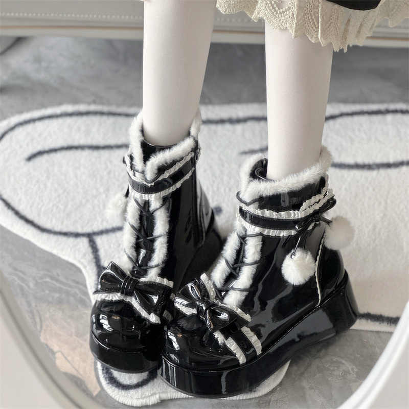 ショートブーツ 甘い毛玉のリボンロリータスノーブーツ2024年新型厚底ギャザーで暖かく可愛い冬用コットンブーツ