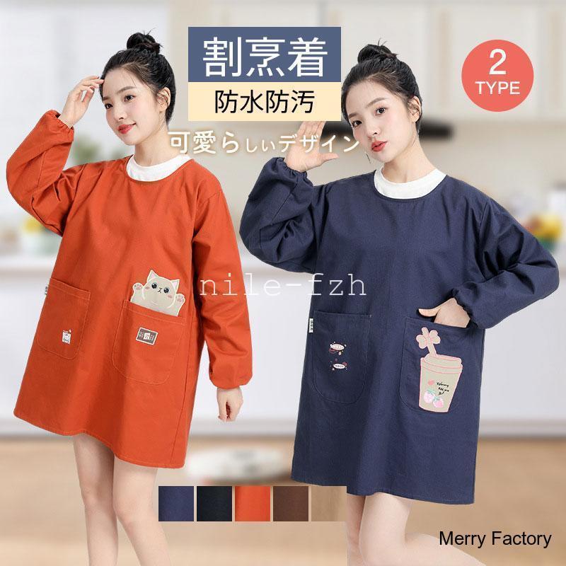 割烹着 エプロン 料理 保育士 秋 冬 猫柄 ゆったり おしゃれ ロング丈 あったか 防汚 可愛い ポケット付き 防水 大きいサイズ 家事 長袖
