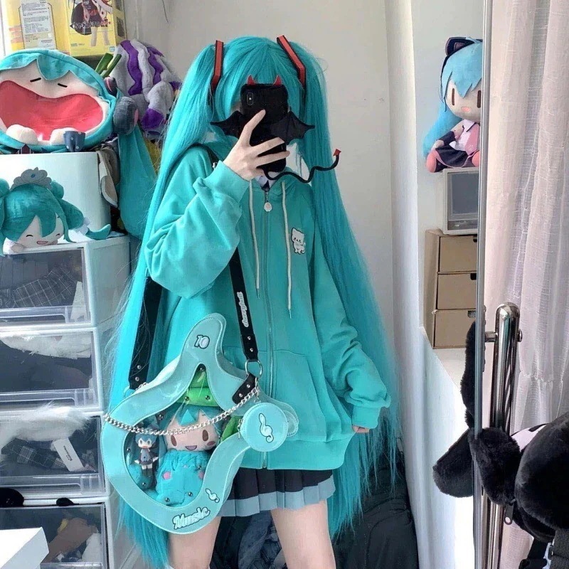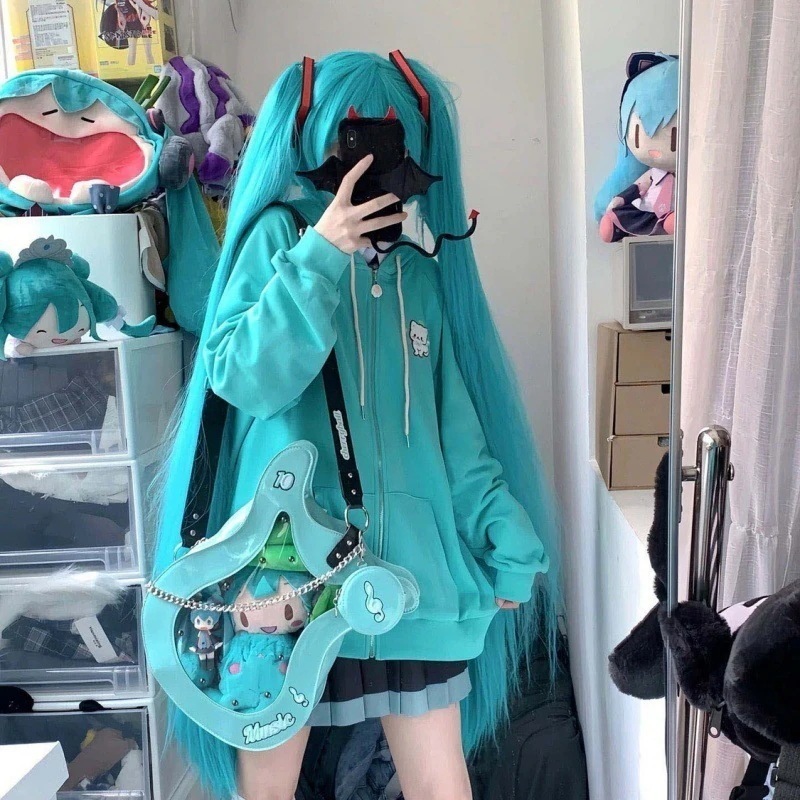 猫の刺繍ネギグリーンがかわいい2026春百合二次元 パーカー レディース マウンテンパーカー 可愛い 連帽衛衣女加絨コート フード付き スウェット ハローキティ 春冬 トップス 韓国ファッション