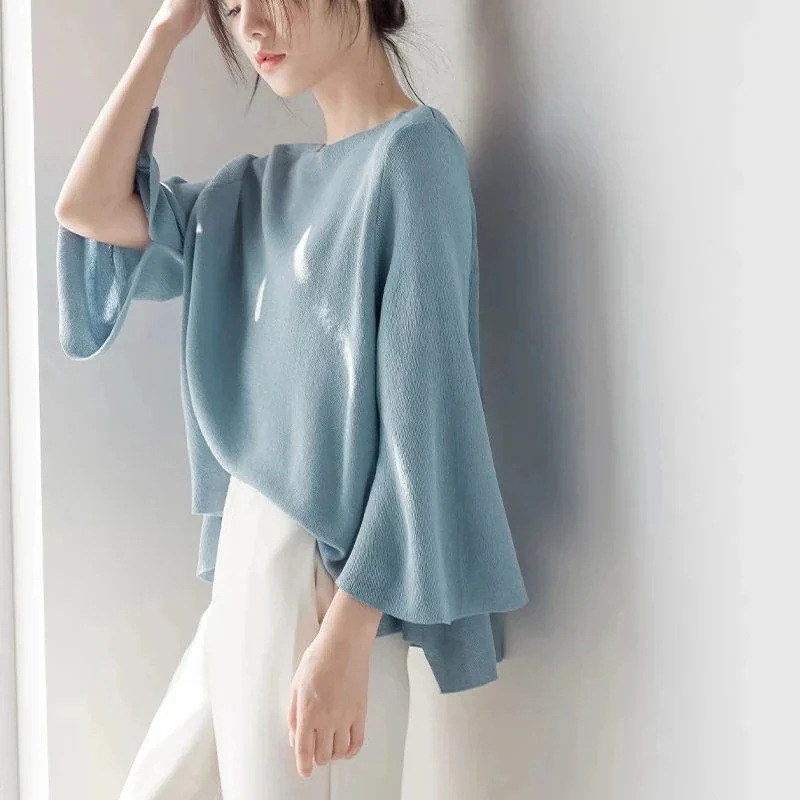 夏 韓国 シアーシャツ ト Tシャツ ップス 氷感 アイスシルク ニットカーディガン シャツ レディース シースルーシャツ フレアスリーブ 七分袖 ボートネック