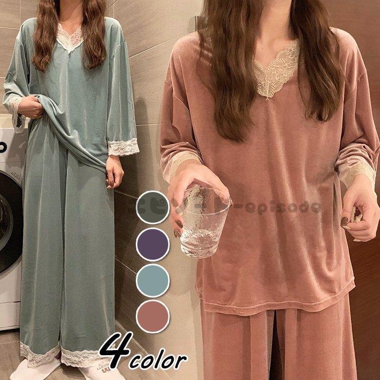 パジャマ モコモコルームウェア レディース 長袖 パジャマ レースVネック ルームウェア ベル