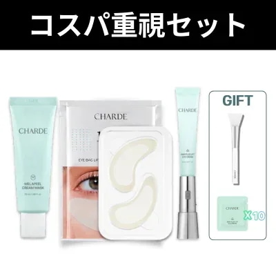 メガ割で気になっていた CHARD のケヴィンコラボセットを購入しました✨ セット内容は ・メラピールクリームマスク ・ニードルショットアイパッチ ・NMN振動アイクリーム さらにギフトで ・スパチュラ ・NMNアイクリームサンプル(1ml×10枚) が付いていて、メガ割限定セットらしくかなり豪華でした。 メラピールクリームマスクは塗って乾かして剥がすタイプのピールオフマスク。 乾いた後に剥がすと、肌表面がなめらかになるような感じでスペシャルケアとして使いやすそうです。 NMN振動アイクリームはヘッド部分が振動するタイプで、目元ケアしながら使えるのが面白いポイント。 テクスチャーはこっくりしすぎず、しっとり保湿される印象でした。 ニードルショットアイパッチは気になる目元に部分的に使えるので、特別ケアとして使いやすそうです。 サンプルのNMNアイクリームもたくさん付いていたので、旅行用や持ち運びにも便利そうでした。 メガ割限定セットで内容も豪華だったので、目元ケアやスペシャルケアを試してみたい方には良いセットだと思いました✨