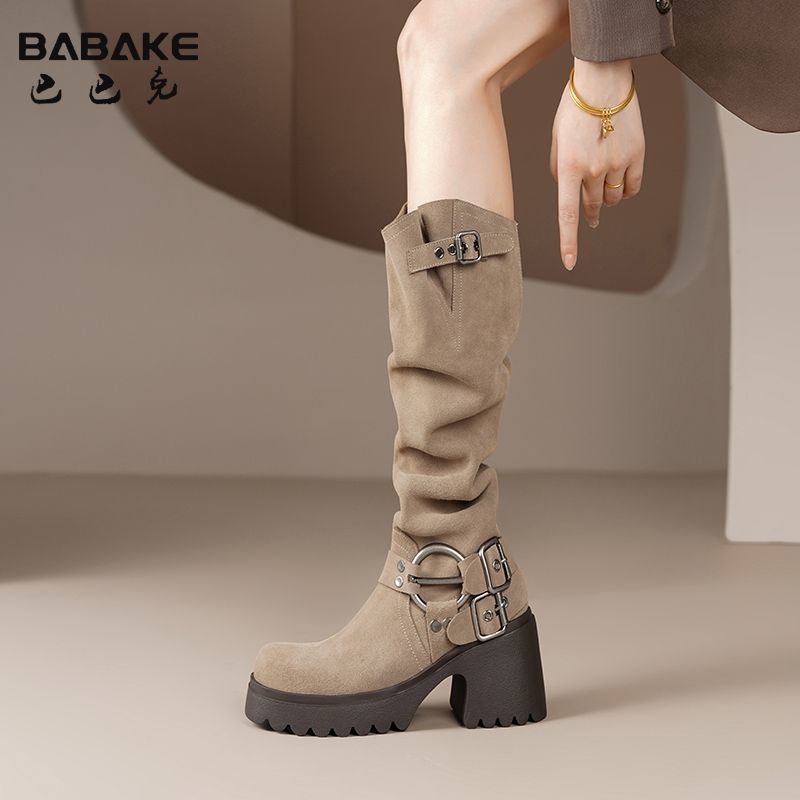 韓国ファッション ロングブーツ ハンドメイド婦人靴2024秋冬新作スリム見えスクラブ厚底スタッズブーツ女性太ヒールブーツ