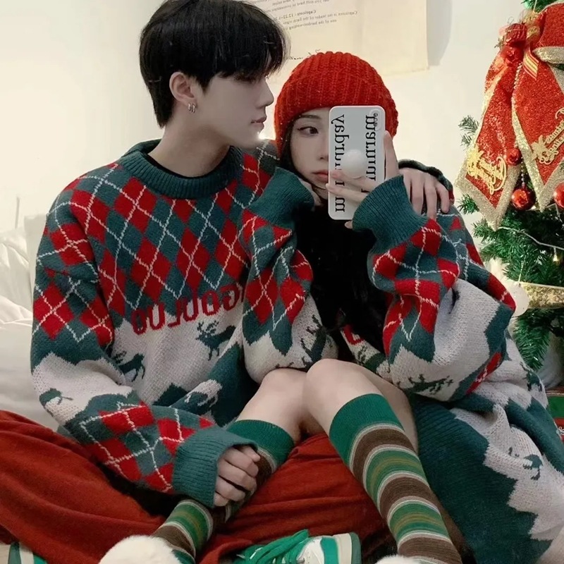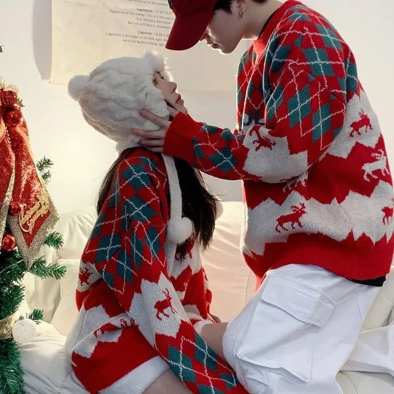 2024新作クリスマスレッドセーター女性の外着ゆったりデザインの気だるい風のかわいいニットトップス 男女兼用トップス