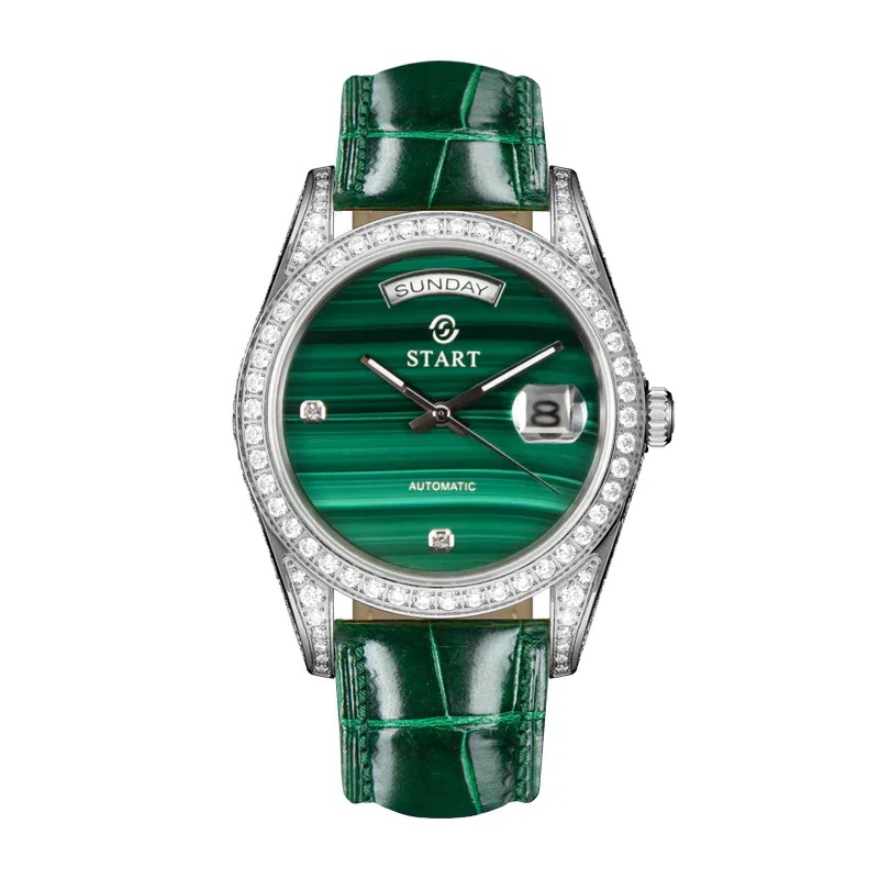 STARTマラカイトメンズ腕時計スイスの全自動機械式ムーブメントダイヤモンドウォッチ防水日付週機能自動機械式時計バタフライバックルアリゲーターレザーストラップ