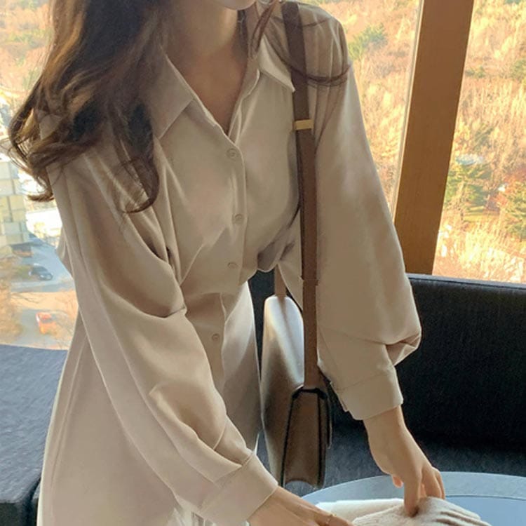 シャツワンピースオフィスレディースエレガントロングワンピース長袖韓国ファッションリボンボリュームスリーブ大人可愛い通勤お呼ばれマキシワンピースボリューム袖薄無地ロングワンピース