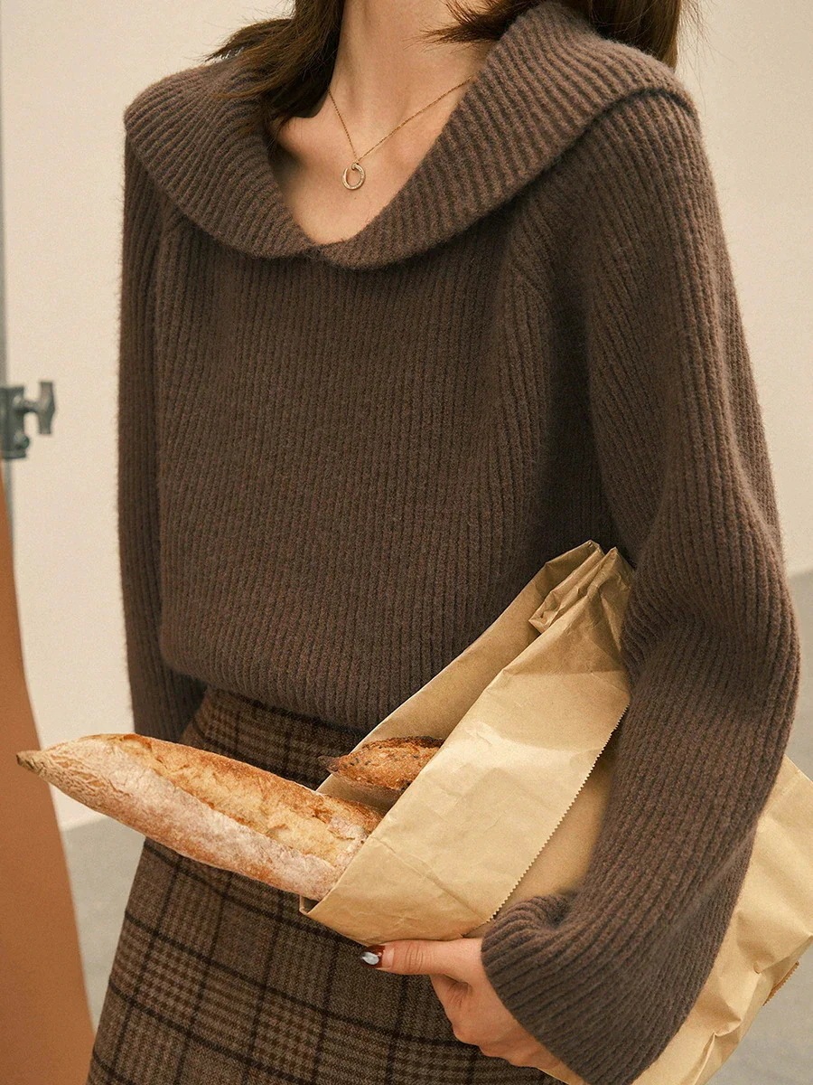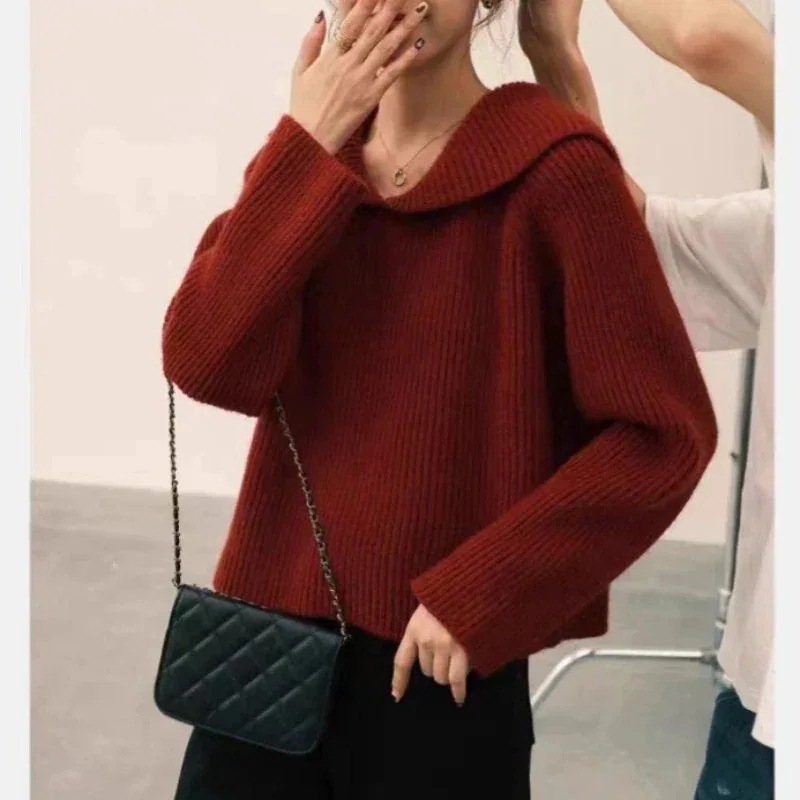 新しい怠惰な風ソフトプルオーバージャンパー女性を裏返す レトロな秋と冬のニットのトップスは襟赤ジャンパー女性