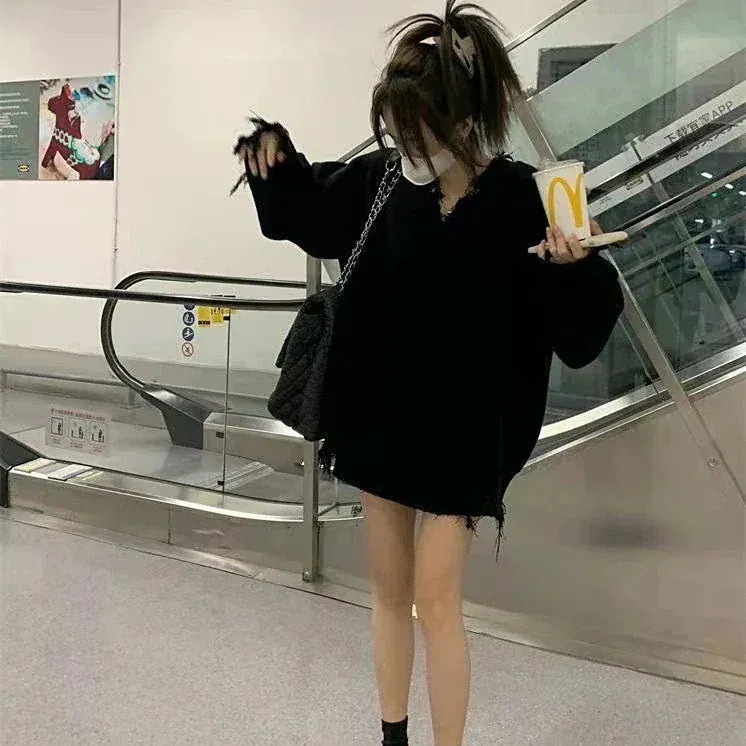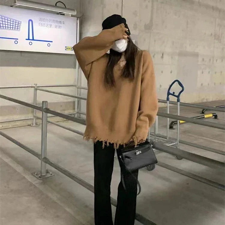 人気なリブニット ベーシックニット 韓国版vネックフリンジのけだるい風セーター女性の秋冬デザイン感ニッチデザインニットゆったり着やせトップス