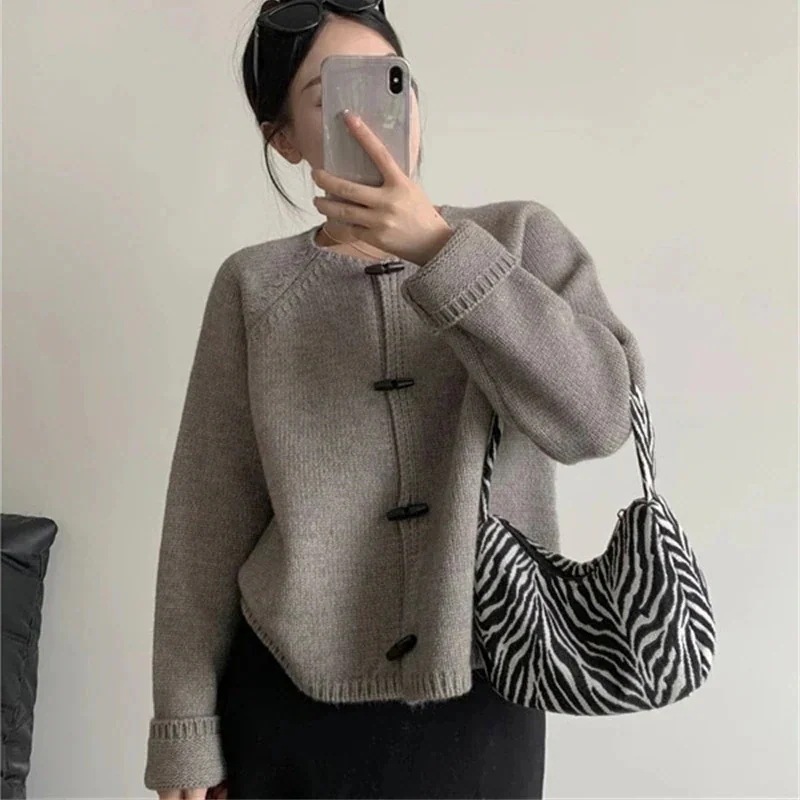 人気なリブニット ベーシックニット だるい風の日系牛角ボタンセーターコート女性の秋冬ゆったり外着小柄ニットカーディガントップス