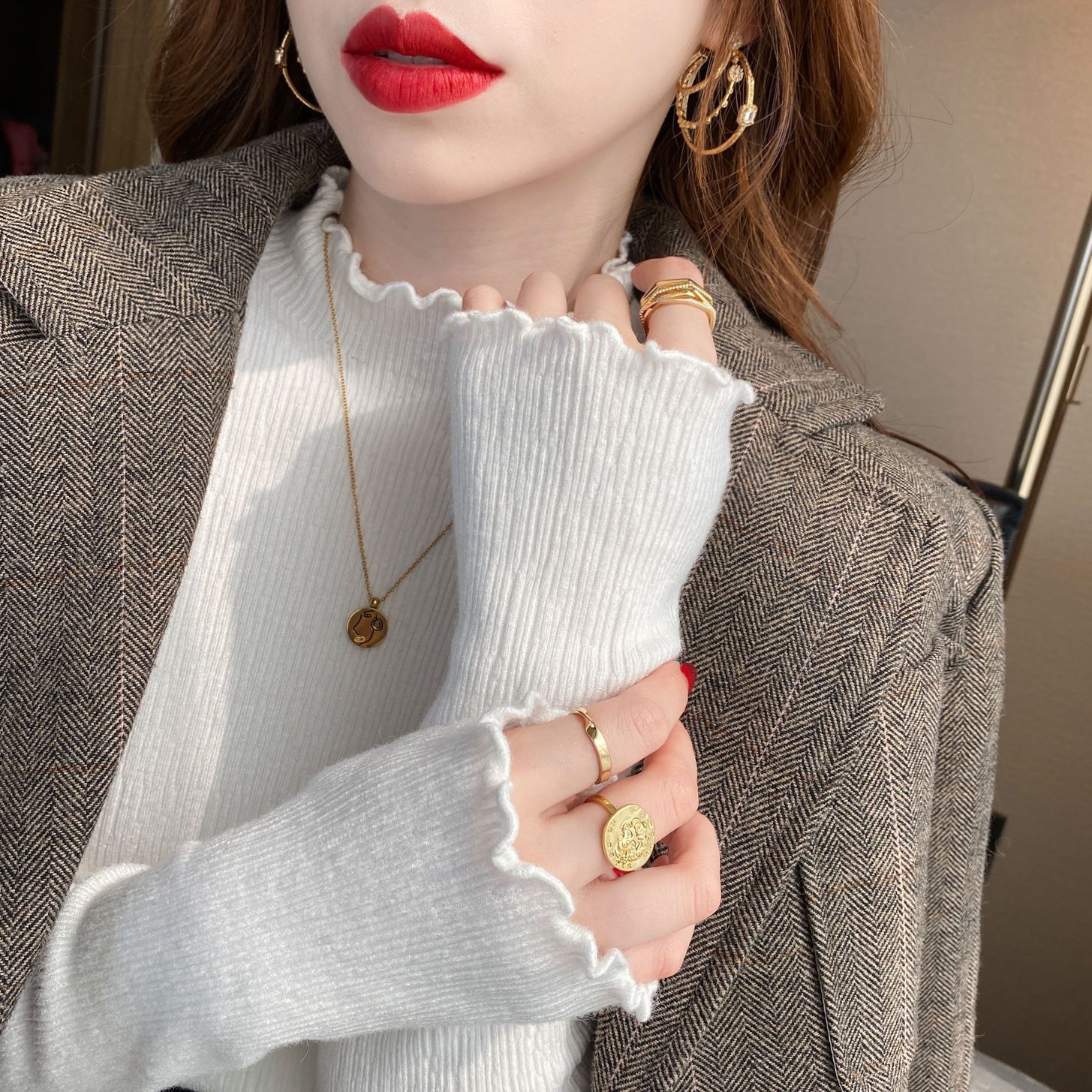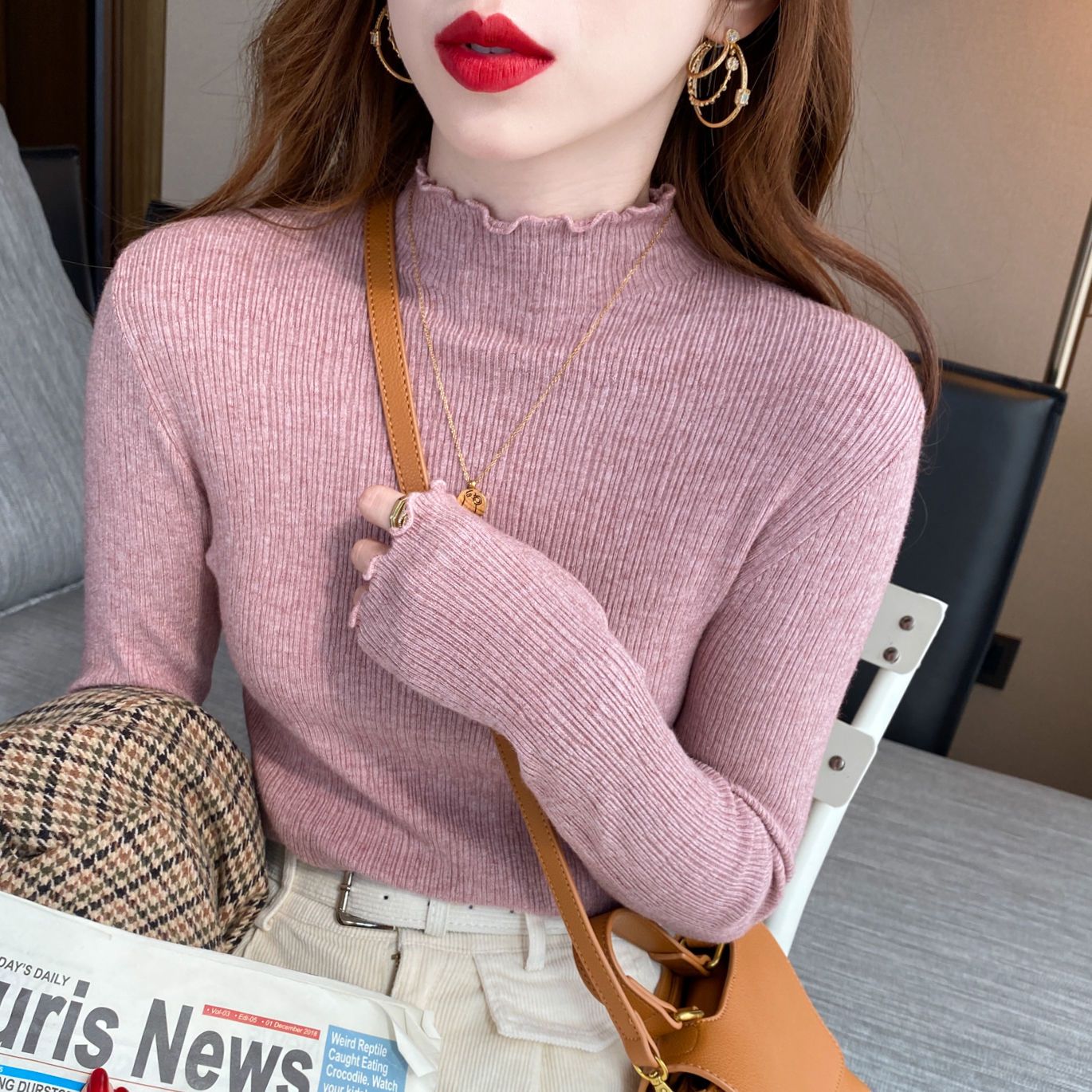 人気なリブニット Tシャツカットソー ベーシックニット ハーフネック アンダーウェア ニット レディース 春秋 新作 韓国ファッション 気質 百掛け 長袖 トップス