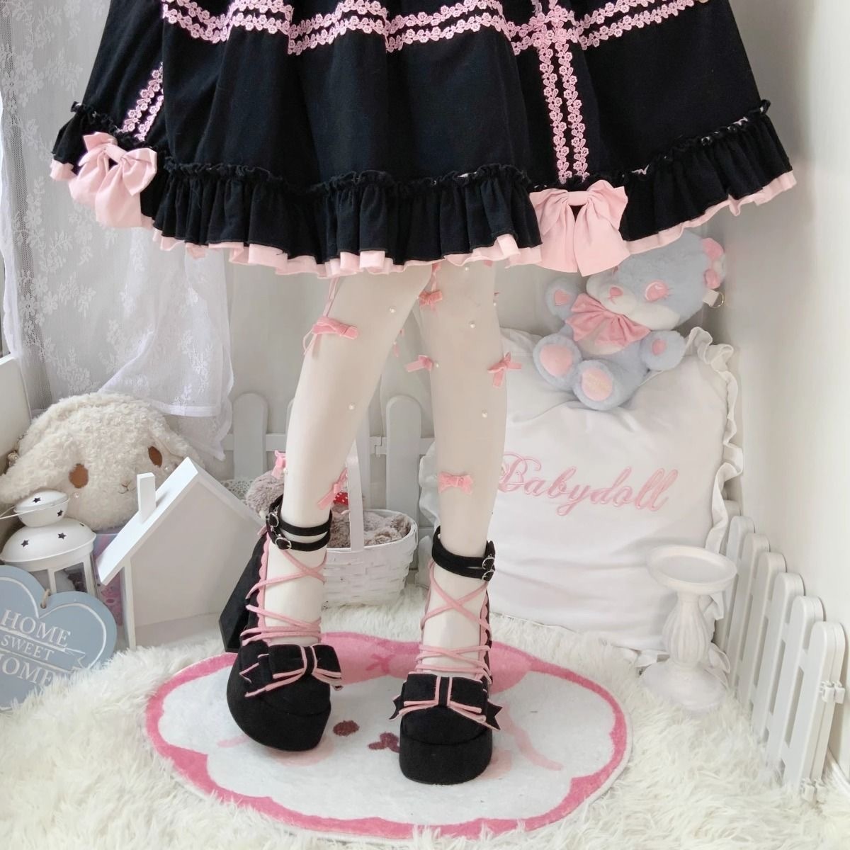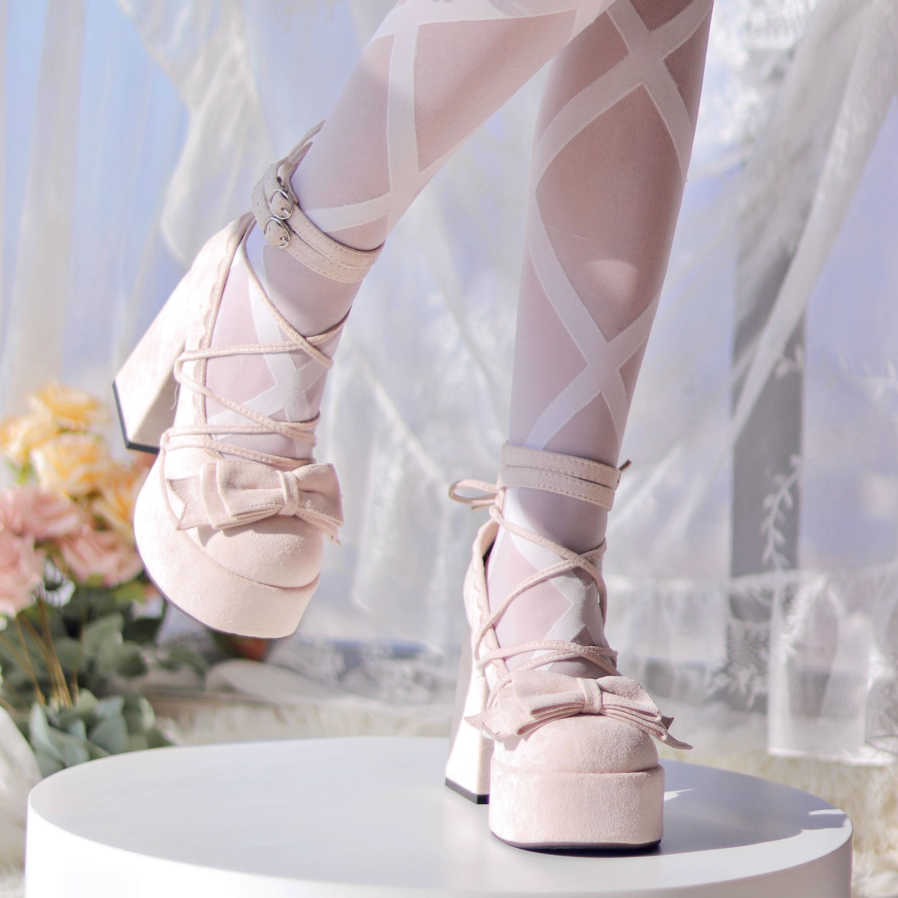 ロリータシューズ ハイヒール 甘い小柄ハイヒールオリジナルスエードフレンチバインダーリボンがエレガントなプリンセスシューズ