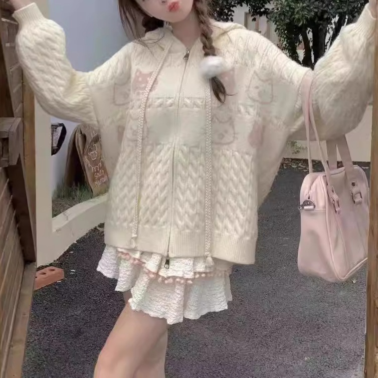 日本猫長袖ジャガードニットトップ 2024 秋冬新作フード付きキュートで甘い学生コートセーター