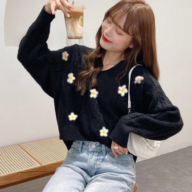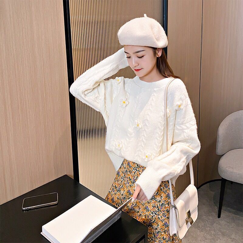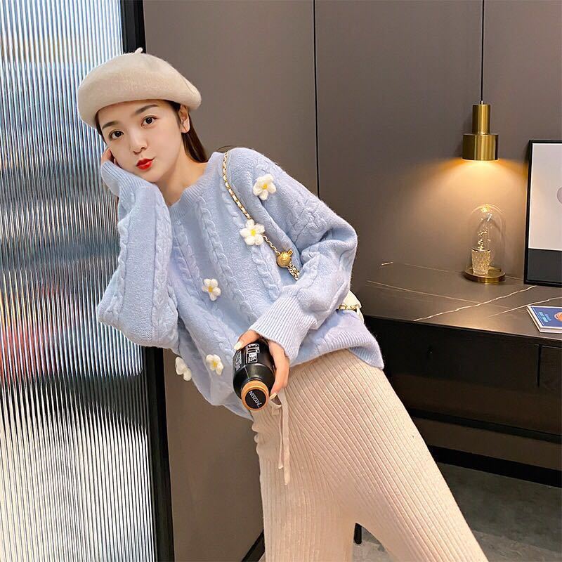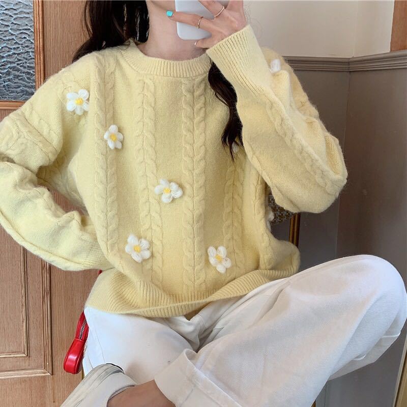 緩い韓国スタイル怠惰な日本スタイル甘くてかわいい学生底セーター春と秋の新しいプルオーバーフラワーセーター女性のための