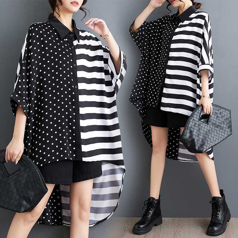 「ファットガール」 2024/夏/大きいサイズ/ゆったり/薄手/ボーダースプライシング/ミドル丈/ロンT/シャツ30%までに制限