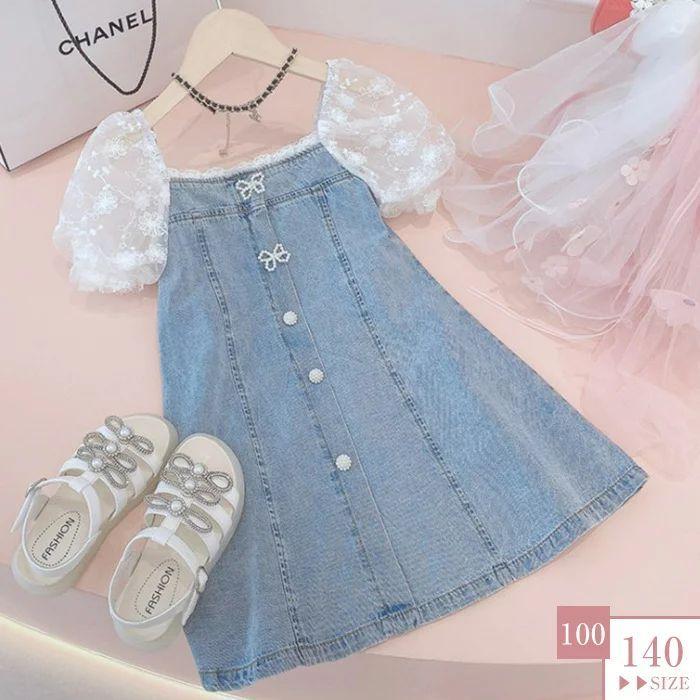 【迅速な出荷】ワンピース 女の子 デニム 袖レース キッズ ワンピ 半袖 Aライン デニムワンピース 子供服 服 かわいい 膝丈 カジュアル 韓国子供服 ゆったり 保育園 普段着