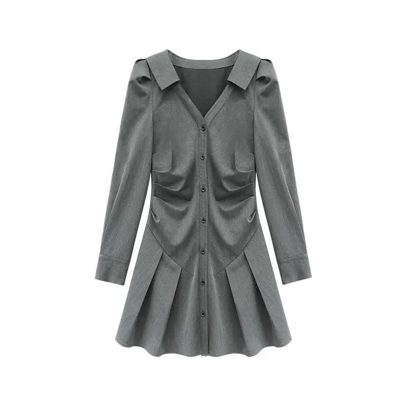 韓国風 シンプル レディース シャツワンピース 長袖 ひざ丈 無地 ワンピース お洒落 Vネック 母の日