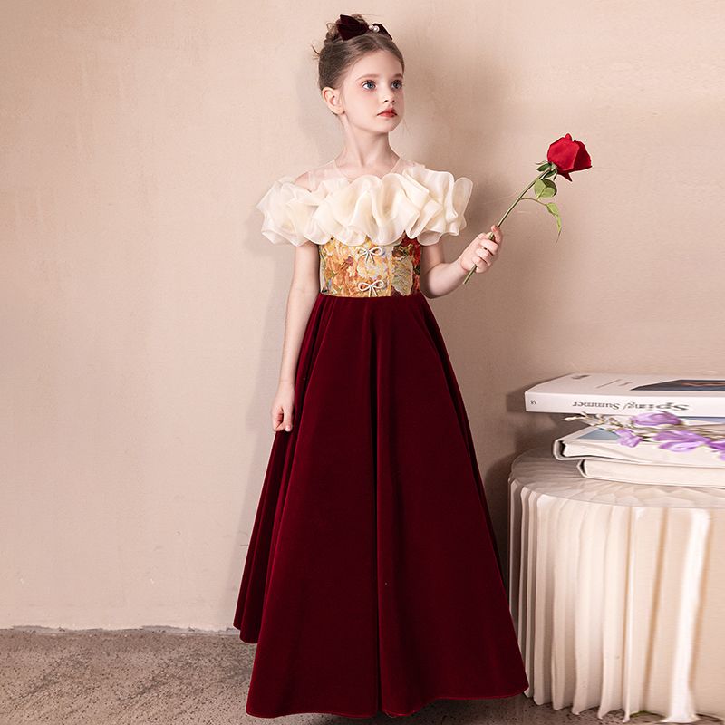 レッドガールステージホスト子供用パフォーマンス服フラワーガールウェディングドレスリトルガール誕生日プリンセスドレス