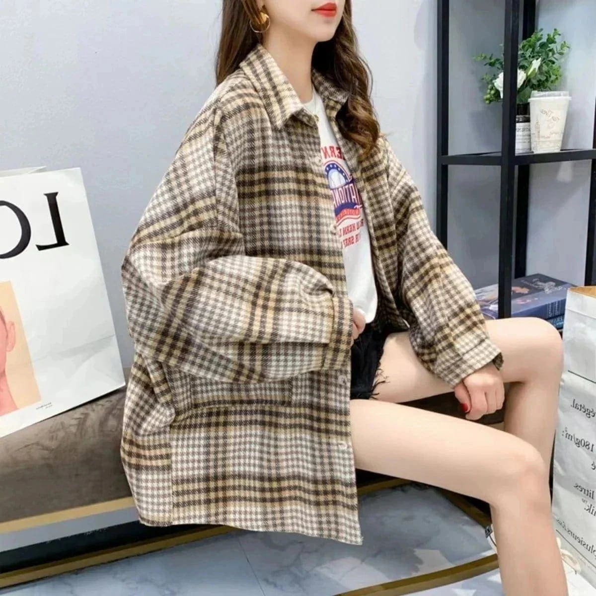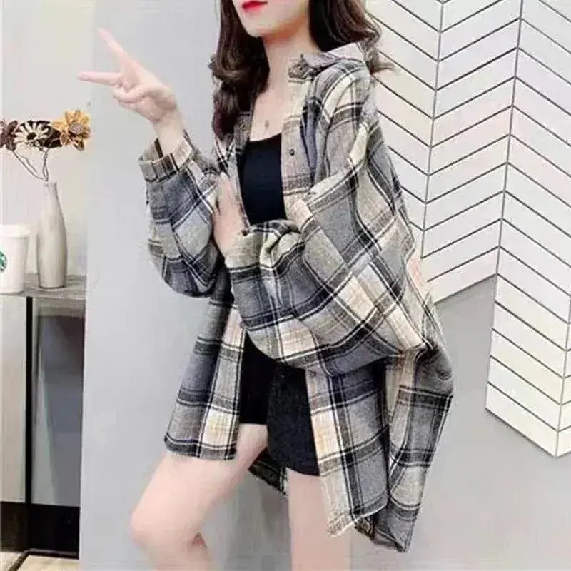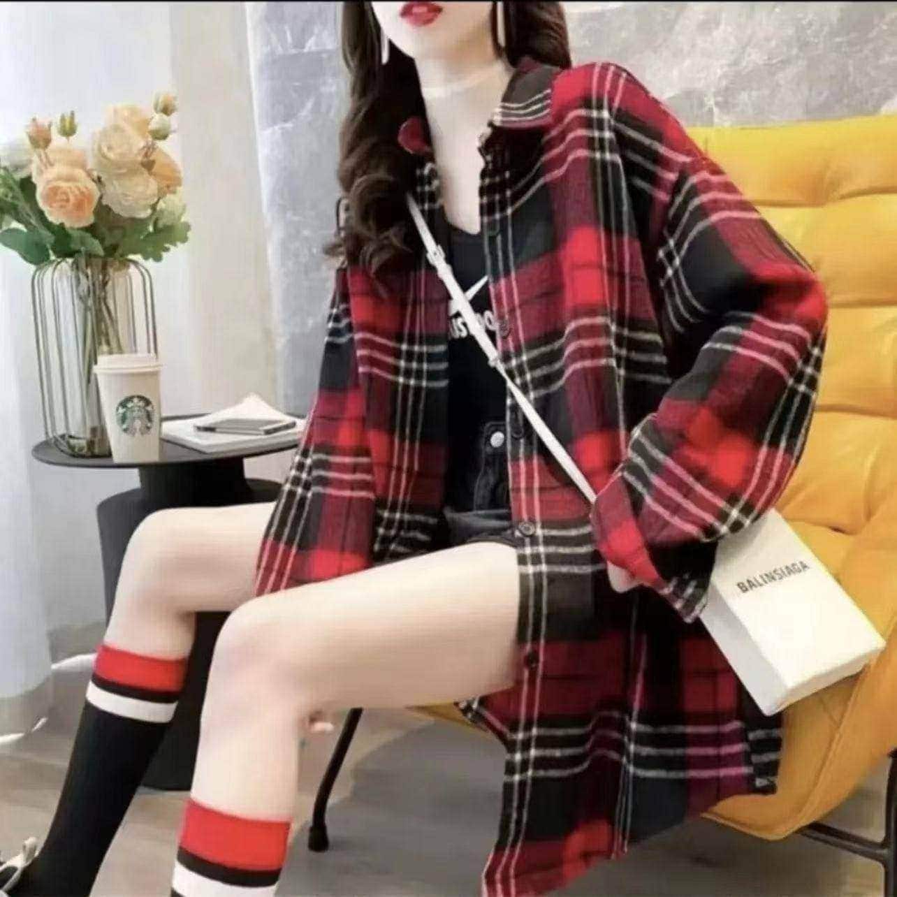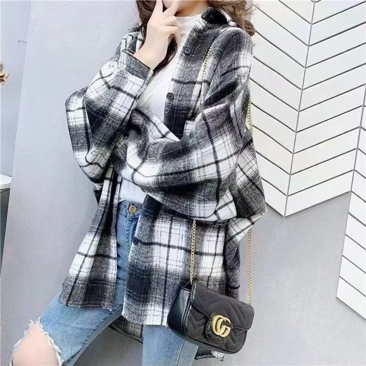 シャツ 長袖 2025 秋 新作 ブラウス チェック ロング ツイードシャツ
