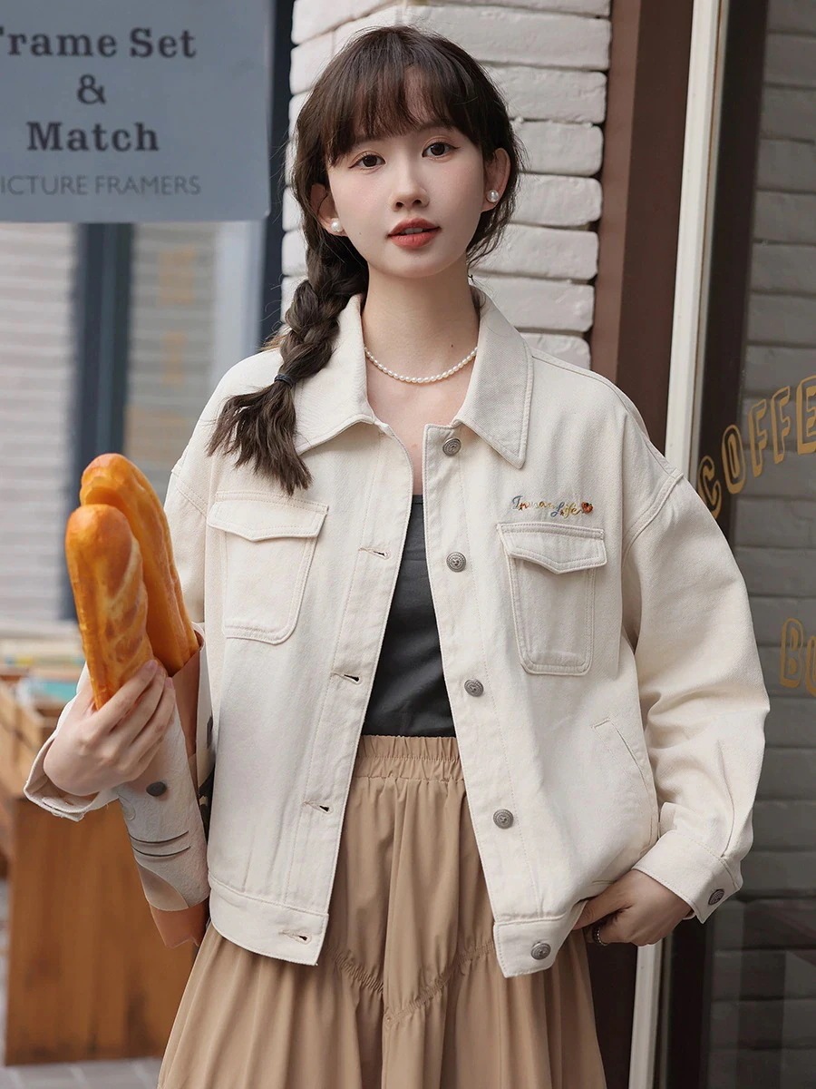 レディースデニムジャケット2025春の新作ゆったりアルファベット刺繍ホワイトワークジャケットショートジャケット