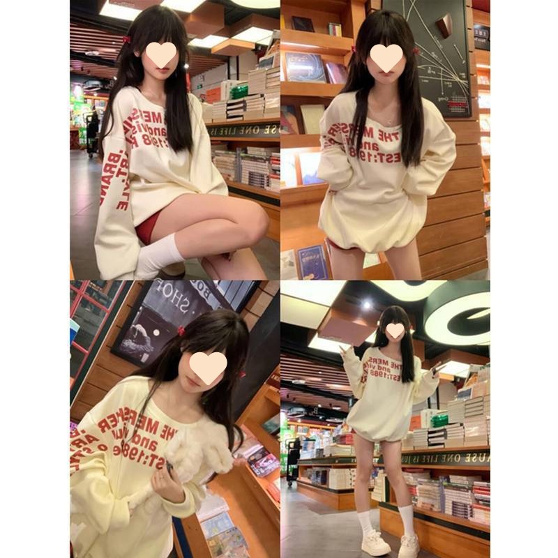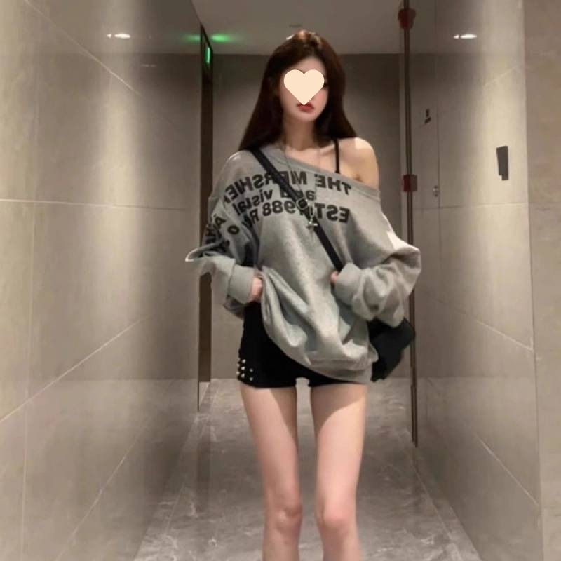 女子学生のための傾斜肩レターデザイン長袖トレーナー新しいホットガールルーズニッチ秋と冬露出鎖骨トップ