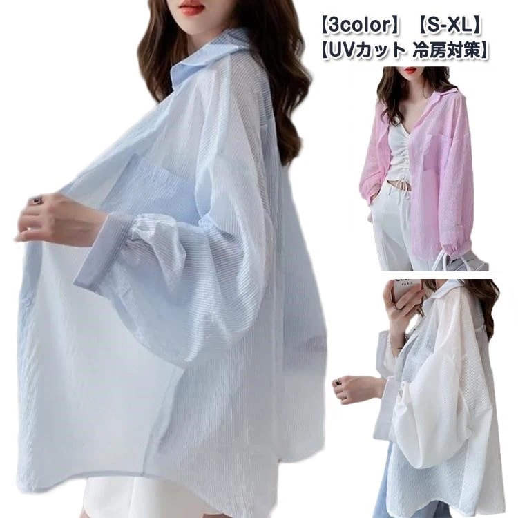 シャツ レディース 長袖 シアーシャツ UV対策 紫外線対策 冷房対策 透け感 トップス 春 夏 シフォン ブラウス シースルー ストライプ柄 薄手 レギュラーカラー ぽわん袖 ボリュームスリーブ ド