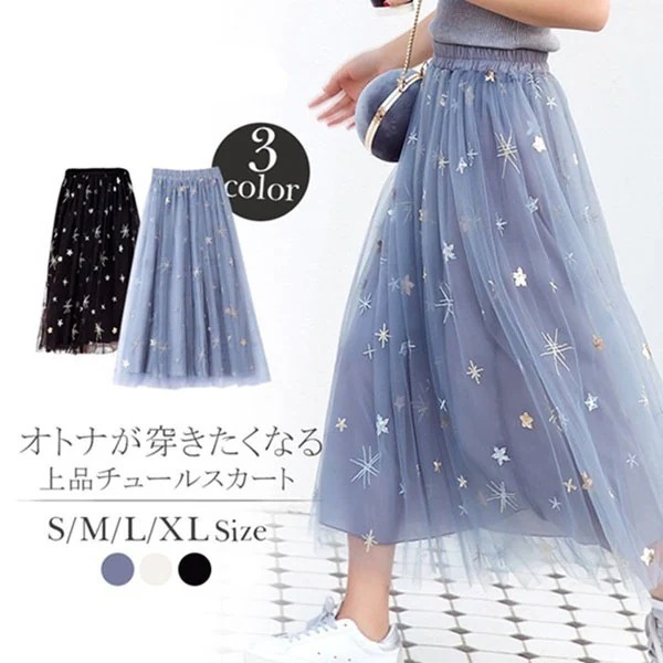 大人気 品質保証大人っぽく色っぽい雰囲気に星柄刺繍のチュールスカートスカート ミモレ丈 ロング丈 ふんわりチュール フレア チュチュスカート レディース ボトムス スカート Aライン ウエストゴム30